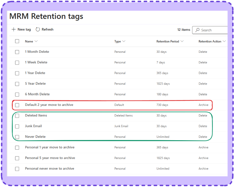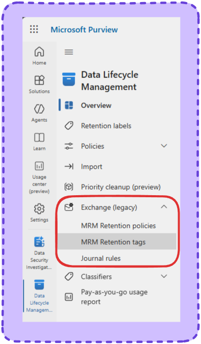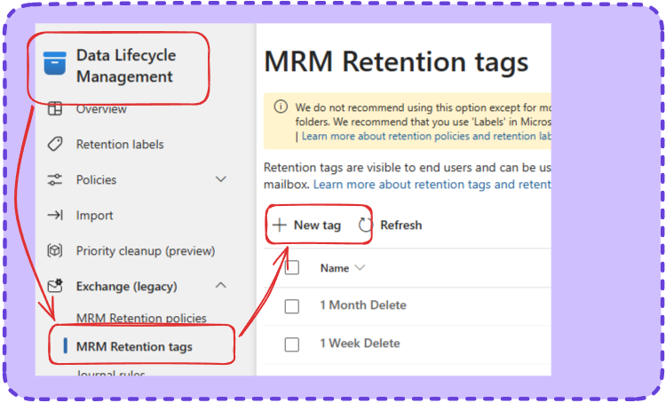 Head on back to Purview > Solutions > Data Lifecycle Management > Exchange Legacy > MRM Retention tags and hit ‘New tag’