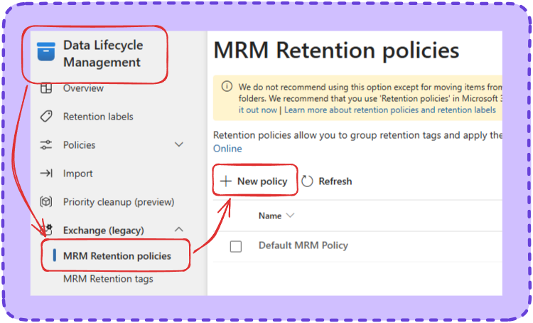 Head on back to Purview > Solutions > Data Lifecycle Management > Exchange Legacy > MRM Retention policies and hit ‘New policy’