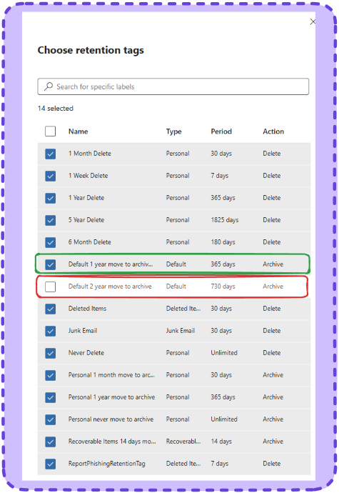 Make a new policy and for fuck sake name it appropriately. Click on ‘Add tag’ and choose every tag EXCEPT the original 2 year move to archive tag, make sure your new 1 year tag is chosen instead.