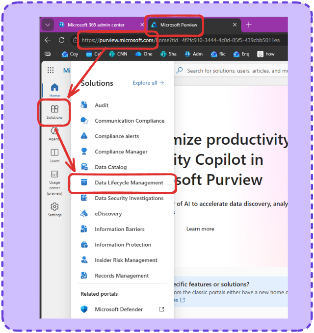 Head to the Microsoft Purview Admin Portal and go to Solutions > Data Lifecycle Management