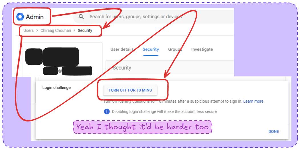 users > the user > security > turn off login challenge