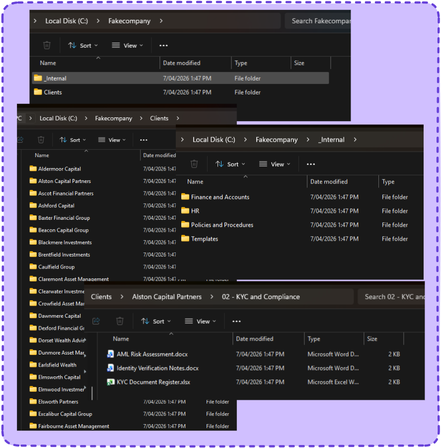 Literally what it says on the tin, created 100 folders of fake folder structure that looks like a finance company. Word Docs and all.