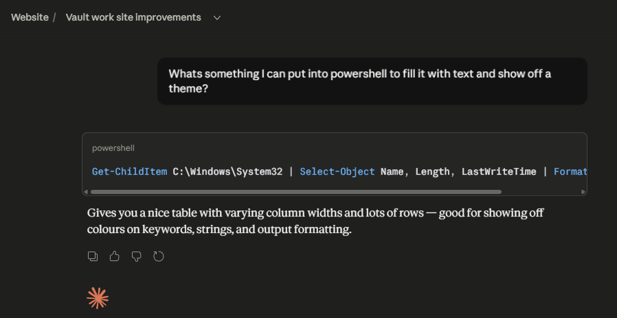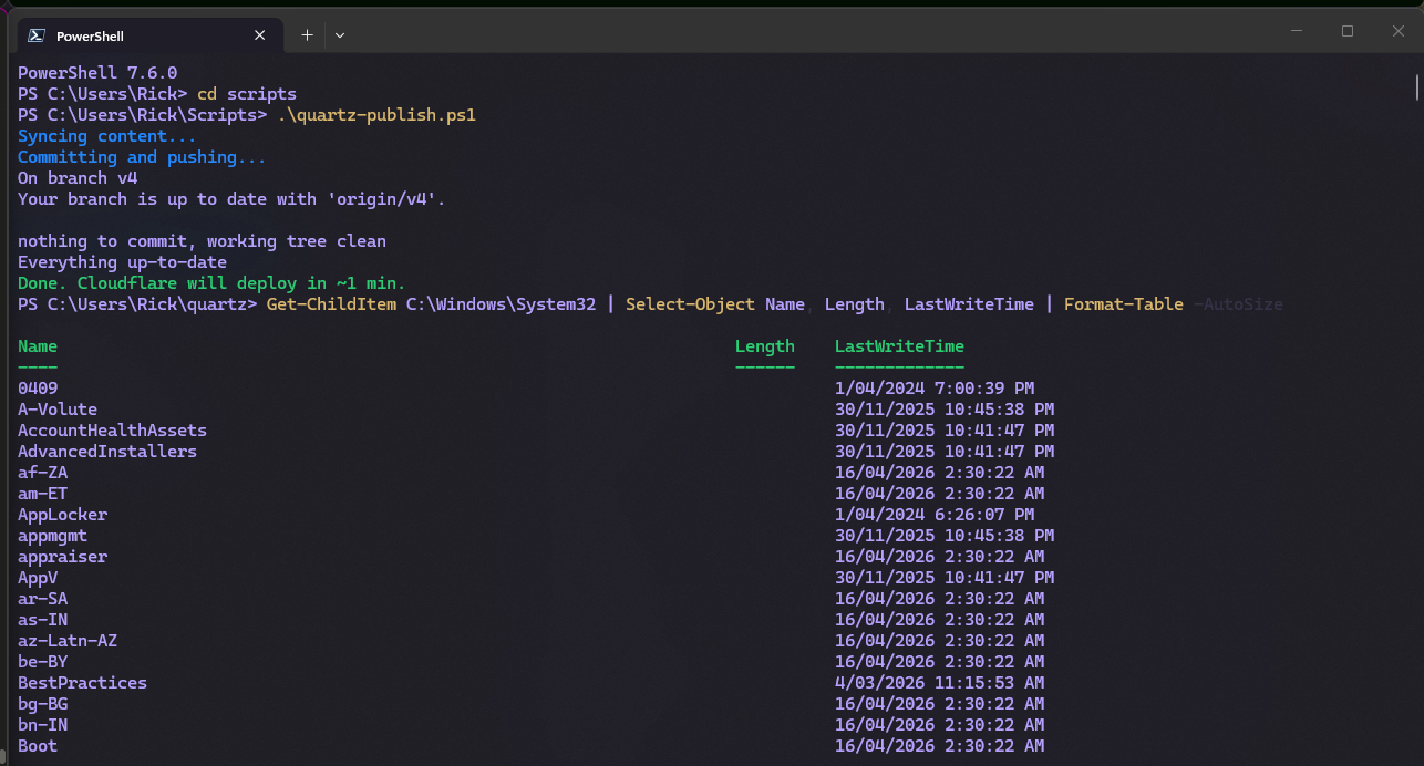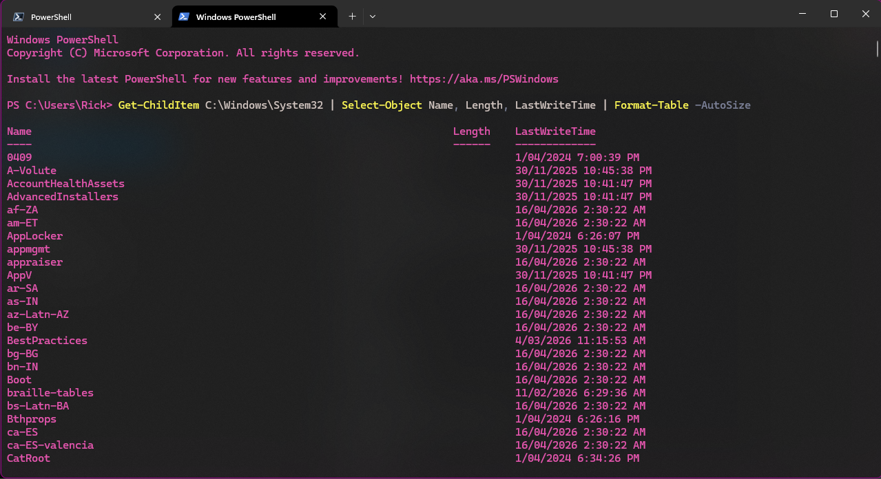 Get-ChildItem C:\Windows\System32 | Select-Object Name, Length, LastWriteTime | Format-Table -AutoSize